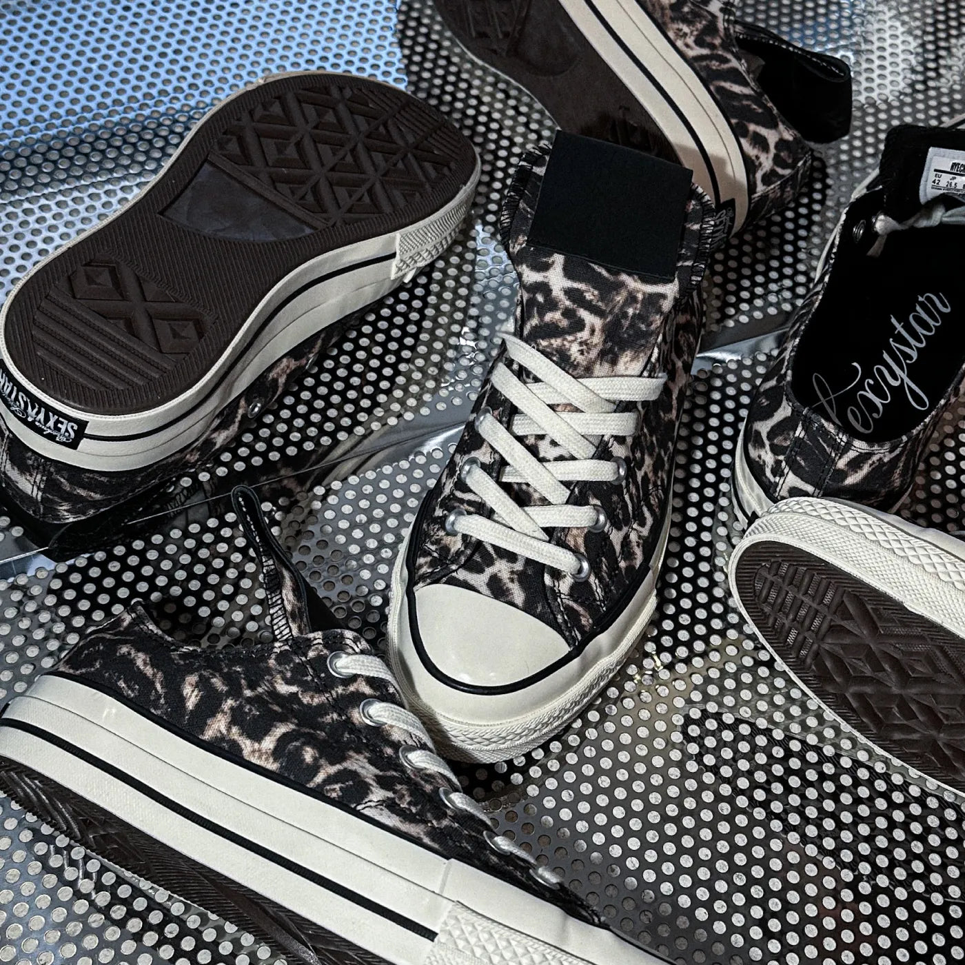 ヴィンテージライクなレオパード柄キャンバスに、生成りのラバーテープ&太めコットンシューレース。