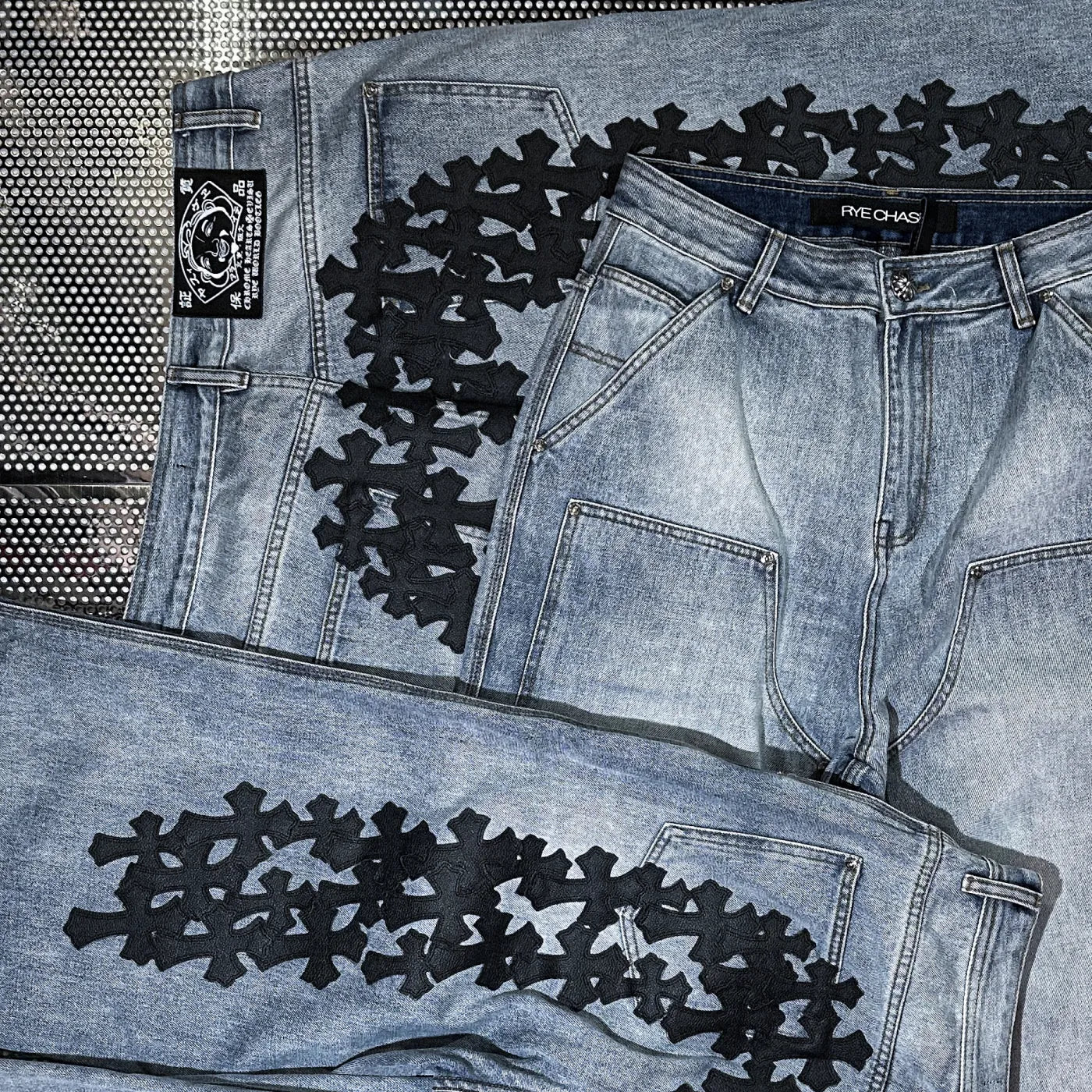 ライトウォッシュのデニムに、重なり合うブラックのクロスパッチを大胆配置。